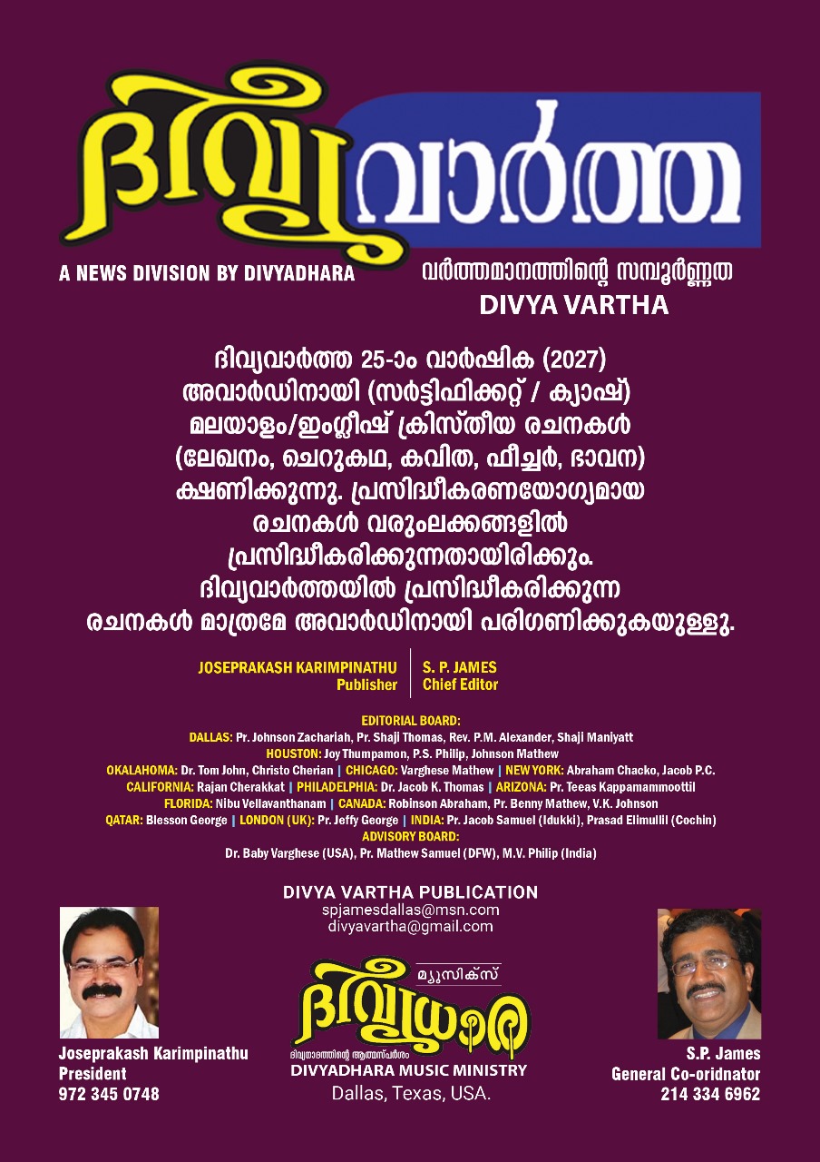 ഡാളസ്: ഡാളസ് പട്ടണത്തിലെ മലയാളി പെന്തക്കോസ്തൽ സഭകളുടെ ഐക്യവേദിയായ ഡാളസ് സിറ്റി-വൈഡ് ഫെലോഷിപ്പിന്റെ ചെയർമാനായി പാസ്റ്റർ തോമസ് മുല്ലയ്ക്കലും കോ-ചെയർമാനായി ഡോ. തോമസ് ഇടിക്കുളയും സെക്രട്ടറിയായി എസ് പി ജെയിംസും ട്രെഷററായി തോമസ് ചെല്ലേത്തും തിരഞ്ഞെടുക്കപ്പെട്ടു. ഇക്കഴിഞ്ഞ നവംബർ 15-ന് ഡാളസിൽ കൂടിയ പൊതുയോഗത്തിൽ വച്ചാണ് 2026-2027 വർഷത്തേക്കുള്ള പുതിയ ഭാരവാഹികളെ തിരഞ്ഞെടുത്തത്. കഴിഞ്ഞ എട്ടുവർഷങ്ങളിലായി…